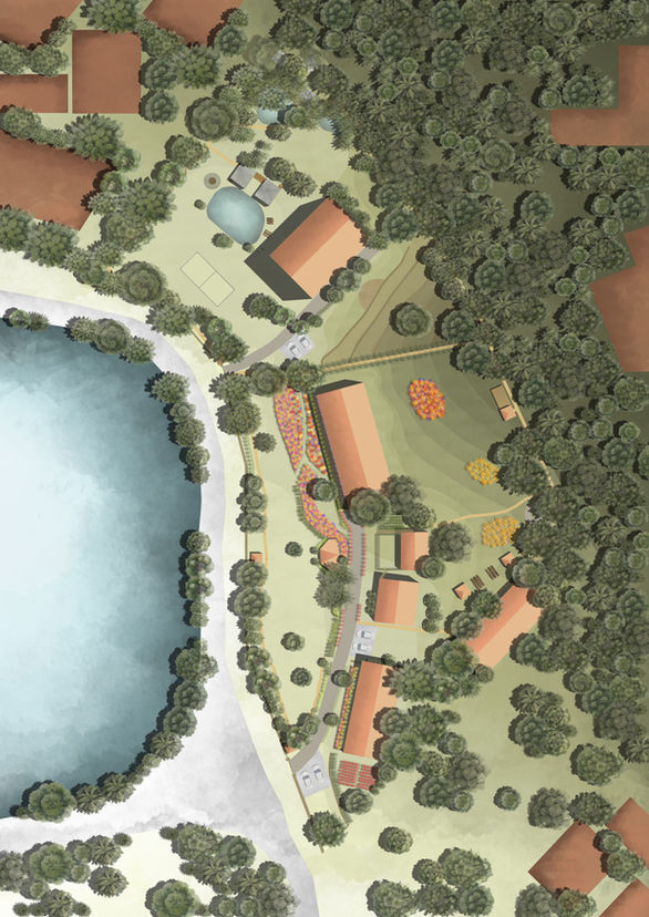 At the heart of this land, there lies a natural spring that flows year round, which provides water to the entire property. Using this natural spring water, a set of thermal baths are proposed, near a natural outdoor waterfall cradled by lush ferns. This is the soul of the project. There are three bath houses - one enclosed bath house with a well from which the untreated springwater is extracted, a second enclosed bath house with a heated pool, and a third open to sky heated pool, under the trees. Stone, wood, lime, springwater, and the scent of fresh fern and eucalyptus.